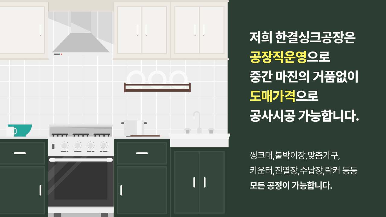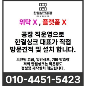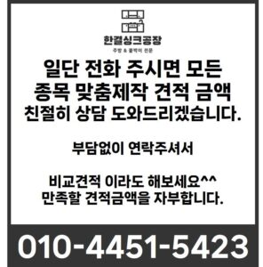 한결싱크공장공장직운영 및 젊은 감각 디자이너 제작 소개 문자 전화 ☎ 010-4451-5423 [365일 연중무휴 24시간 상담] 토,일요일 상담가능 저희 한결싱크공장은 젊은 감각의 고급디자인의 주방 및 맞춤가구 자체제작공장을 운영하고 있습니다. 견적문의 주시면 거품없는 가격으로 100% 만족하실겁니다! 시공 사례 싱크대 100% 시공사진 붙박이장 100% 시공사진 화장대 및 장 100% 시공 시스템헹거 100% 시공사진 주문제작 100% 시공사진 공장사진 100% 실사진 무료 전화상담 문자상담 홈 소개 회사 및 브랜드 소개 서비스 안내 서비스 및 가격 안내 문의하기 문의사항 남겨주시면 확인 후 답변드립니다.